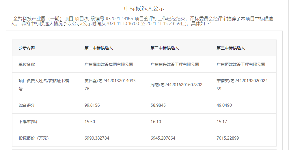 ?金羚科技產(chǎn)業(yè)園(一期)項(xiàng)目[項(xiàng)目/標(biāo)段編號:JG2021-13165]項(xiàng)目的評標(biāo)工作已經(jīng)結(jié)束,評標(biāo)委員會經(jīng)評審?fù)扑]了本項(xiàng)目中標(biāo)候選人。 現(xiàn)將中標(biāo)候選人情況予以公示(公示時間從2021-11-10 16:00 至 2021-11-15 23:59止),具體如下: